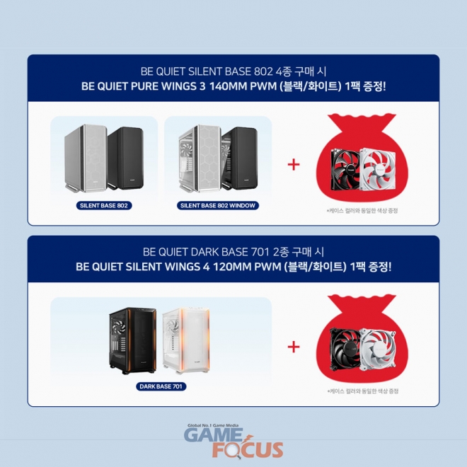 정숙성과 확장성을 겸비한 SILENT BASE 802 시리즈 4종 구매 고객은 고풍압 140mm 쿨링팬 be quiet! PURE WINGS 3 140mm PWM(블랙/화이트) 1팩을 받을 수 있으며 하이엔드 타워형 케이스 DARK BASE 701 시리즈 2종 구매 시에는 프리미엄 팬 라인업 be quiet! SILENT WINGS 4 120mm PWM(블랙/화이트) 1팩이 제공된다 색상은 구매한 케이스 컬러 및 행사 구성에 따라 배정된다.