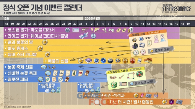 한편 정식 서비스 오픈을 기념해, 사전등록에 참여한 유저 전원에게 헤어스타일, 성장 아이템, 라이드 이매진(탈것) 등 다양한 보상이 지급된다. 또한 로그인만 해도 코스튬과 라이드 등 다양한 보상을 획득할 수 있는 7일 로그인 이벤트와 실버 스타 카니발, 별과 불꽃의 밤, 겨울맞이 축제 등 다양한 이벤트를 통해 풍부한 즐길 거리를 선보일 예정이다.