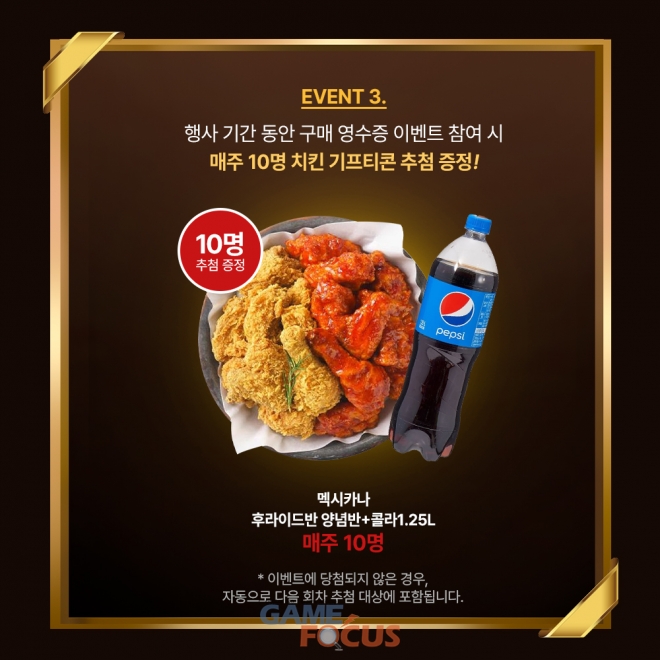 또한 행사 기간 동안 구매 영수증 이벤트에 참여한 고객을 대상으로 매주 추첨을 통해 총 10명에게 치킨 기프티콘이 증정된다. 당첨자에게는 멕시카나 후라이드반·양념반 치킨과 콜라 1.25리터 구성의 기프티콘이 제공되며, 추첨에서 선정되지 않은 참여자는 자동으로 다음 회차 추첨 대상에 포함된다.