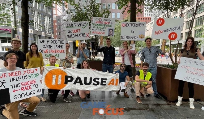 인류의 생존권을 위협하는 첨단 AI 개발을 중단할 것을 요구하는 시위자들(이미지 출처 PauseAi 페이스북)