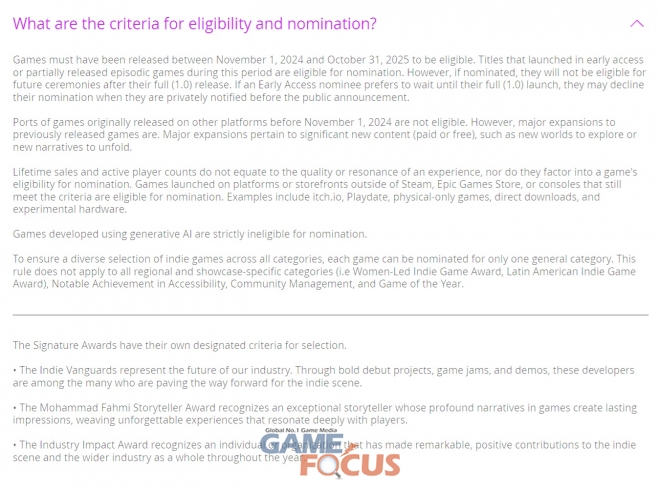 프로그램 제작사인 식스 원 인디(Six One Indie)은 공식 성명서를 통해 “후보 등록 과정에서 개발사들에게 생성형 AI를 사용하지 않는다는 서약을 필수조건으로 내걸고 있고 33원정대 개발사 역시 이 항목에 동의했다”고 해명했다. 시상식 당일 개발사인 샌드폴 인터랙티브는 “제작 과정에서 AI 아트를 일부 활용했다”고 밝히며 “문제가 된 개발 리소스는 게임 내에서 패치로 수정되었다”고 입장을 밝혔지만 IGA는 원칙에 의거해 최종적으로 모든 수상 목록에서 33원정대의 수상을 취소했다.