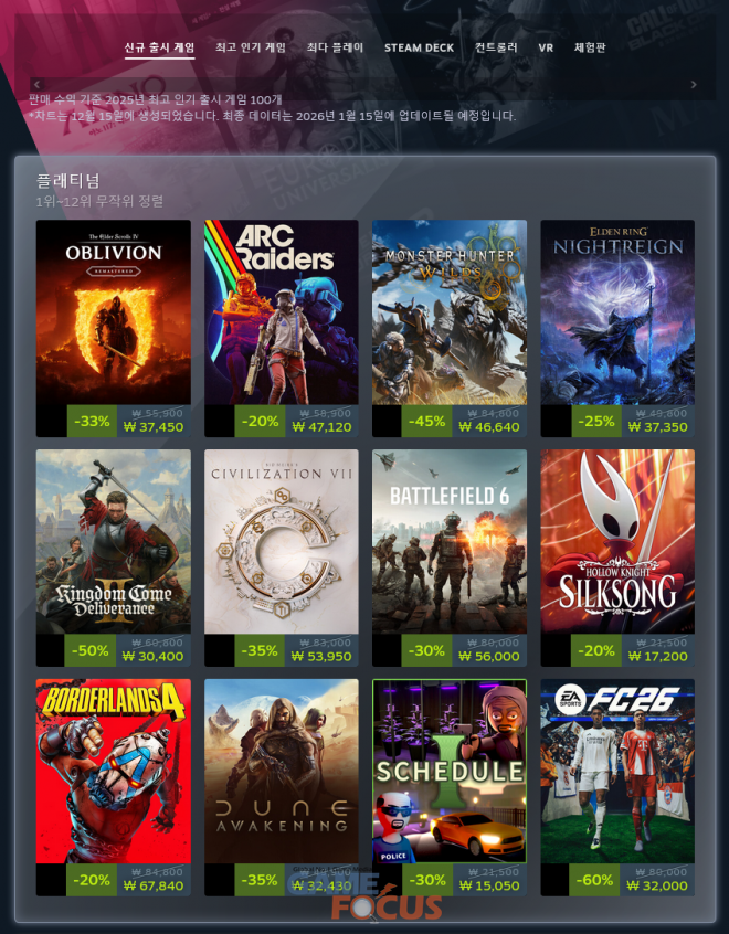신규 출시 게임 플래티넘 등급에는 올해 2월 말 출시돼 '스팀' 전체 동시 접속자 수 5위(138만 명)를 기록한 '몬스터헌터 와일즈'를 비롯해 ▲'킹덤 컴: 딜리버런스 2' ▲배틀필드 6 ▲할로우 나이트: 실크송 ▲보더랜드 4 ▲엘든 링 밤의 통치자 ▲문명 7 등 굵직한 게임들이 플래티넘 부문에 올랐다. 특히 넥슨 자회사 엠바크 스튜디오에서 개발한 PvPvE 익스트랙션 슈터 '아크 레이더스'도 여기에 이름을 올리면서 올해 올해 최고의 화제작 중 하나임을 증명했다.