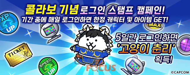 이벤트 기간 중에 로그인하면 하루 한 개씩 스탬프를 받을 수 있으며 5일간 로그인하면 콜라보 한정 EX캐릭터 ‘고양이 춘리’를 획득할 수 있다.