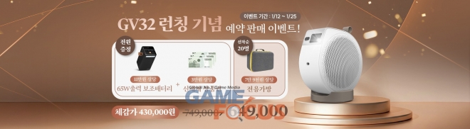 벤큐는 GV32 출시를 기념해 1월 12일부터 1월 25일까지 런칭 예약판매 혜택을 제공한다. 예약판매 기간 동안 GV32는 정가 749,000원에서 649,000원으로 구매할 수 있으며, 구매 고객 전원에게 11만원 상당 65W 출력 보조배터리와 3만원 상당 신세계 상품권을 증정한다. 또한 선착순 20명에게는 7만 9천원 상당 전용가방을 추가로 제공해, 혜택을 합산할 경우 43만원대의 체감가로 제품을 구매할 수 있는 셈이다.