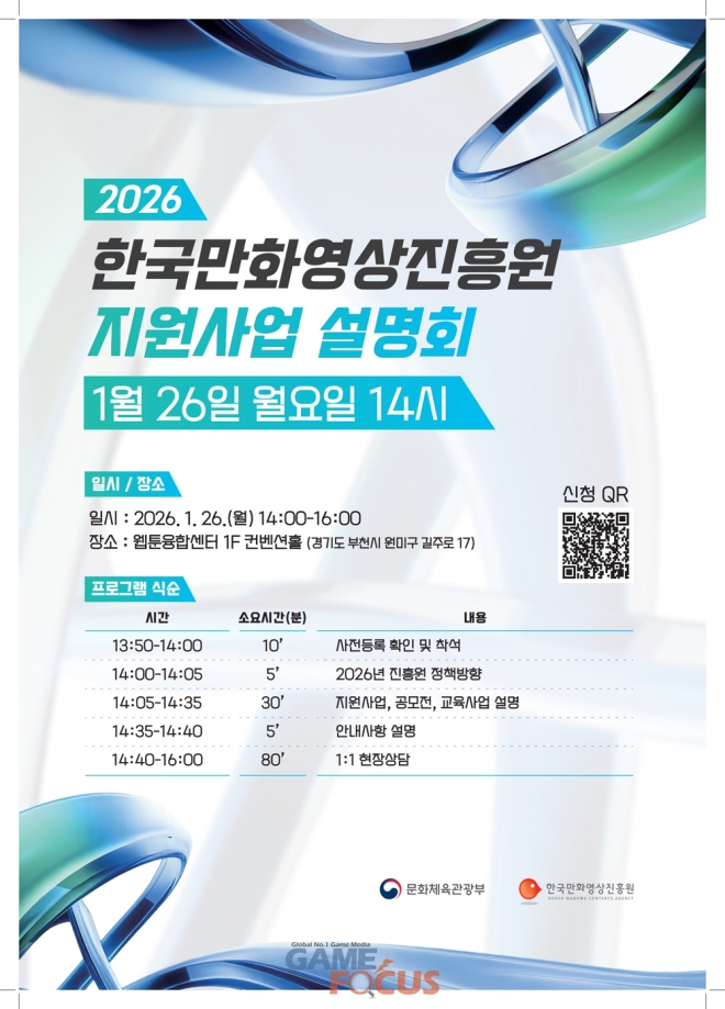 문화체육관광부(장관 최휘영)와 한국만화영상진흥원(원장 백종훈, 이하 진흥원)은 2026년 만화·웹툰 분야 지원사업 설명회를 오는 1월 26일 오후 2시, 웹툰융합센터 1층 컨벤션홀에서 개최한다고 밝혔다.