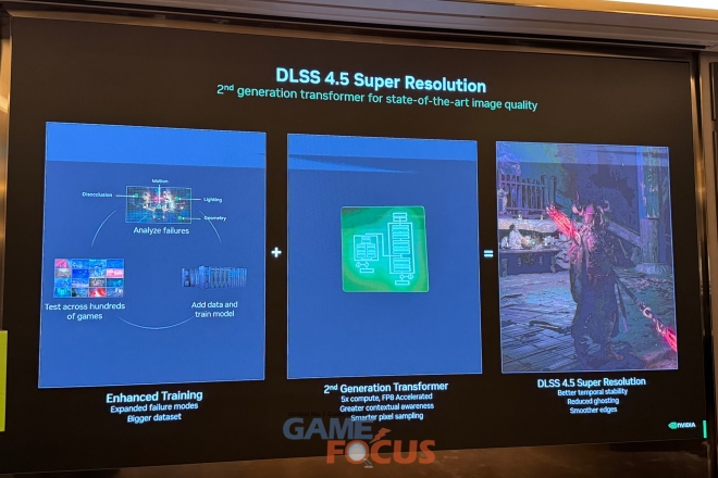 이번 CES 2026에서 엔비디아는 보다 향상된 성능을 지닌 DLSS 4.5 버전을 발표했다. DLSS 4.5는 2세대 트랜스포머 슈퍼 레졸루션과 다이나믹 멀티 프레임 생성 기술 등 두 가지를 골자로 하며, 8년 전 첫 발표 이후 지속된 훈련 루프를 통해 전 세대 대비 컴퓨팅 파워가 향상되고 안티 앨리어싱 개선 및 고스팅 현상 개선이 이루어지면서 퀄리티가 대폭 상승했다는 설명이다.