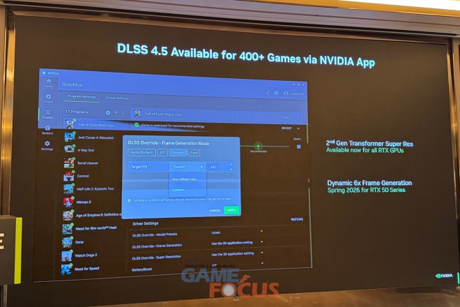 DLSS 4.5는 이미 엔비디아 앱을 통해 400개 이상의 게임에 적용됐다. 2세대 트랜스포머 슈퍼 레졸루션은 모든 RTX 모델에서 지원되며, 동적 6X MFG는 RTX 50 시리즈를 대상으로 지원될 예정이다.