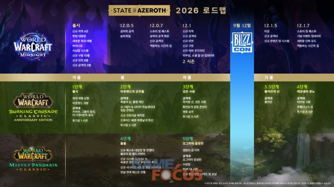 월드 오브 워크래프트 클래식 역시 2026년 한 해 동안 단계적인 확장을 이어간다. 월드 오브 워크래프트: 판다리아의 안개 클래식(World of Warcraft: Mists of Pandaria Classic)의 확산(Escalation) 업데이트를 통해 새로운 퀘스트 대장정과 전장, 시나리오가 추가되며, 올해 하반기에는 오그리마 공성전과 영원의 섬 콘텐츠가 공개될 예정이다. 이와 함께 불타는 성전이 기념 서버로 찾아와 아웃랜드의 상징적인 콘텐츠를 선보일 계획이다.