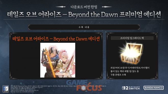 Nintendo Switch™ 2용 ‘테일즈 오브 어라이즈 - Beyond the Dawn 에디션’(한국어판)의 패키지 및 다운로드 버전의 구성이 공개되었다. 패키지 버전의 예약 판매 일정은 추후 공개된다.