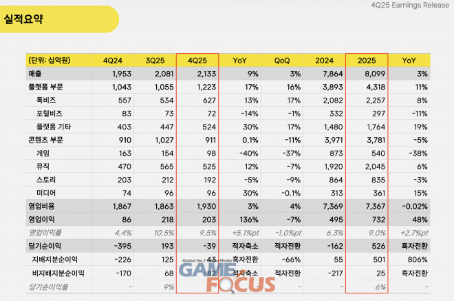 콘텐츠 부문의 4분기 매출액은 9,106억 원으로, 전년 동기와 유사한 수준을 기록했다. 뮤직과 미디어 매출액은 전년 동기 대비 각각 12%, 30% 증가한 5,251억 원, 958억 원을 기록했다. 스토리 매출은 1,918억 원으로, 전년 동기 대비 5% 감소했다.