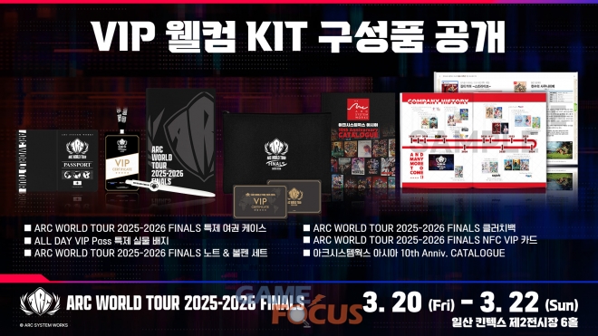 현재 티켓링크를 통해 '아크 월드 투어 2025-2026 파이널'의 ALL DAY VIP Pass를 예매할 수 있다. '길티기어 -스트라이브-'의 주제곡 및 캐릭터 테마송에 보컬로 참여한 보컬 아티스트 'NAOKI'의 첫 내한 라이브 공연 'ARC WORLD TOUR 스페셜 라이브 in KOREA'의 특별 스탠딩 에리어의 선행 입장할 수 있는 우선권을 비롯하여, 파이널 개최를 기념하여 특별 제작되는 기념 굿즈들이 담긴 VIP 웰컴 KIT, 그리고 행사장 내에서 진행되는 각종 이벤트 및 콘텐츠 참가 우대권이 주어지는 ALL DAY VIP Pass의 구매는 행사 종료일인 3월 22일 오후 7시까지 가능하다.