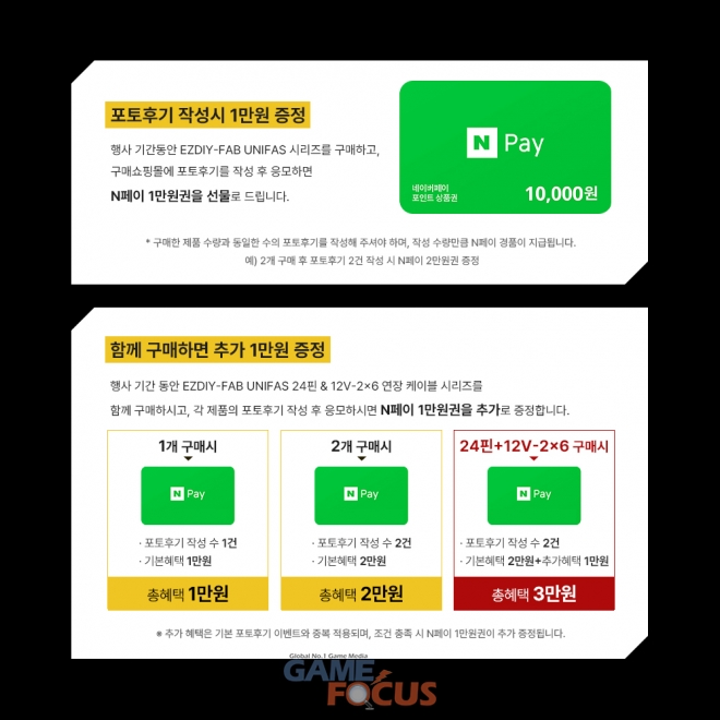 마이크로닉스는 UNIFAS ARGB 연장 케이블 시리즈 출시를 기념해 포토후기 이벤트를 진행한다. 2026년 2월 25일부터 3월 31일까지 제품 구매 후 포토후기를 작성하면 N페이 1만원권을 증정하며, 24핀과 12V-2x6 제품을 함께 구매하고 각각 후기를 작성할 경우 추가 혜택이 제공된다..