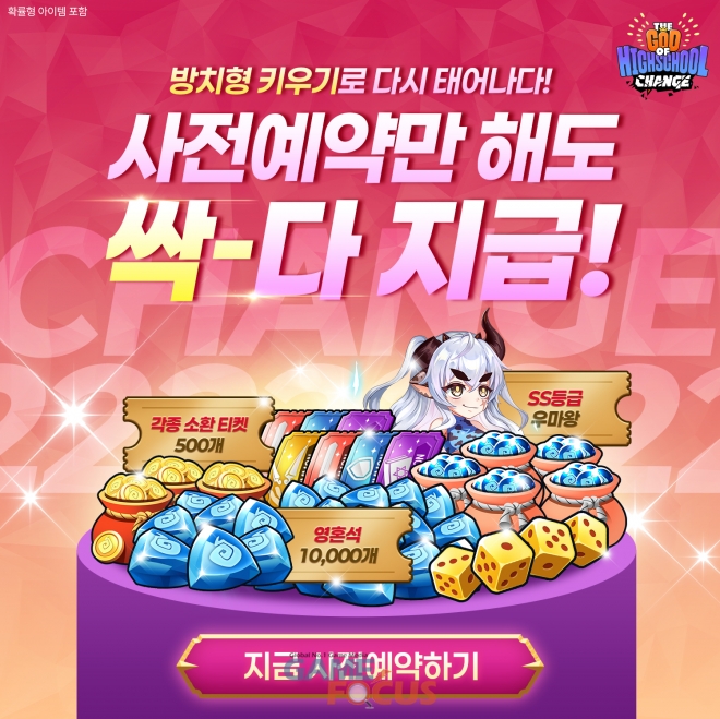 한편 ‘갓 오브 하이스쿨 체인지’는 구글플레이 스토어, 애플 앱스토어, 원스토어로 출시될 예정이며, 사전예약은 2월 25일부터 진행되며 모든 사전예약을 완료할 경우 SS 등급 캐릭터 랜덤 소환권, S 캐릭터 랜덤 선택권, 영혼석, 각종 소환 티켓 등 총 50만원 상당의 상품을 지급할 예정이다.