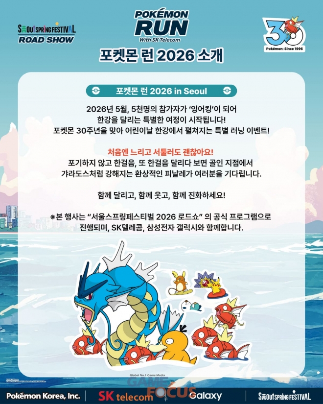 (주)포켓몬코리아(대표 임재범)는 포켓몬 30주년과 어린이날을 기념해 오는 5월 5일 서울 한강 뚝섬공원 일대에서 ‘포켓몬 런 2026 in Seoul’(이하 ‘포켓몬 런’)를 개최한다고 26일 밝혔다.