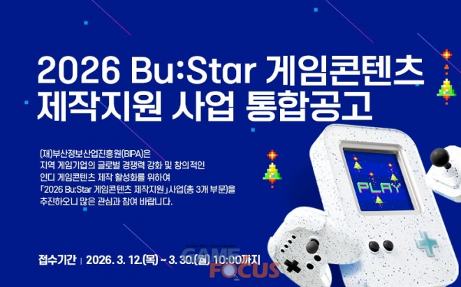 부산광역시와 (재)부산정보산업진흥원(원장 김태열, 이하 진흥원)은 부산 지역 게임 기업의 글로벌 경쟁력 강화 및 창의적인 인디 게임콘텐츠 제작 활성화를 위해 오는 30일까지 ‘2026 Bu:Star 게임콘텐츠 제작지원 사업’ 참가기업을 모집한다고 밝혔다.