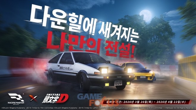 넷이즈게임즈와 레이싱 타이틀 명가 ‘코드마스터즈’의 합작 정통 레이싱 모바일게임 ‘레이싱 마스터(Racing Master)’가 26일부터 ‘이니셜D’와의 콜라보레이션 이벤트를 실시한다.