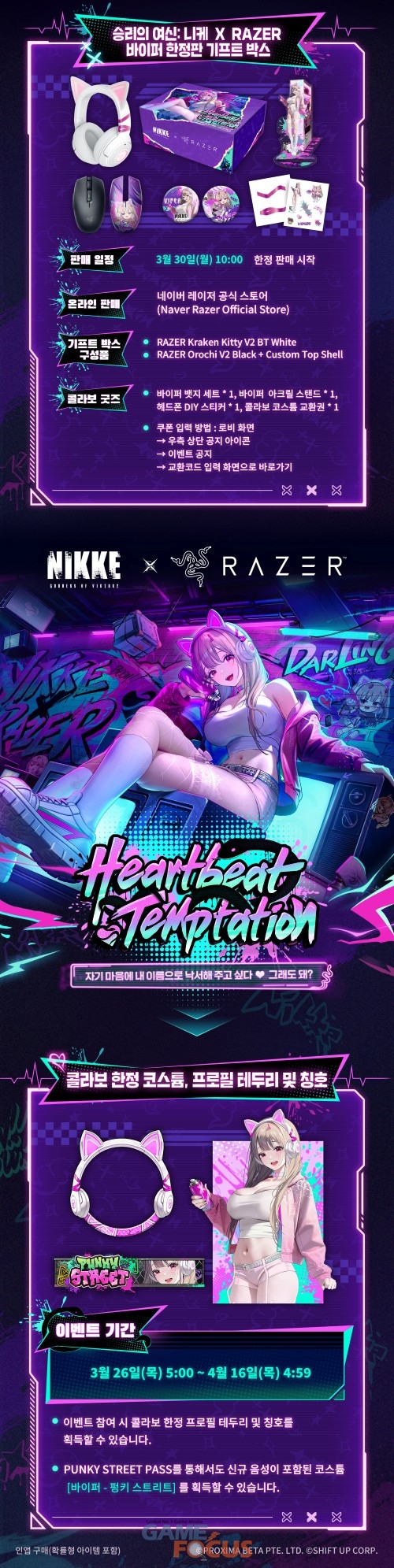 레벨 인피니트는 시프트업이 개발하고 자사가 서비스하는 승리로 향하는 소녀들의 건슈팅 RPG ‘승리의 여신: 니케’와 글로벌 게이밍 브랜드 레이저(RAZER)의 콜라보레이션 기프트 박스 ‘Heartbeat Temptation’을 3월 30일 오전 10시 네이버 레이저 공식 스토어에 출시한다고 금일 밝혔다.