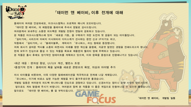 『데이먼 앤 베이비』는 출시 이후로도 플레이어의 의견을 귀담아 들으며, 더욱 깊고 더욱 자극적인 플레이 경험을 위해 지속적인 업데이트가 진행될 예정이다.