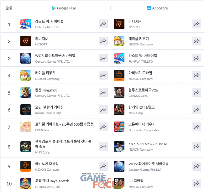 구글 플레이에서는 '라스트 워: 서바이벌', '리니지M', '화이트아웃 서바이벌' 등 3개 게임이 엎치락뒤치락 하는 가운데 순위가 소폭 하락한 '메이플 키우기', 차트 역주행에 성공한 '오딘: 발할라 라이징'과 '트릭컬 리바이브', '마비노기 모바일' 등이 TOP 10을 형성하고 있다.