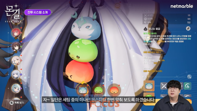 다음 순서로는 전투 시스템과 콘텐츠 소개가 이어졌다. 구독자 144만 명의 유튜버 '테스터훈'이 출시에 앞서 게임을 미리 시연하며 그로기 게이지를 채워 사용하는 '버스트', 제한 시간 내에 몬스터와 보스를 처치하는 '차원 균열', 스토리 진행 중 만났던 보스들과 다시 전투할 수 있는 '토벌', 몬스터들을 키링 형태로 만들어 캐릭터에게 장착하는 '몬스터링' 등 핵심 특징에 대해 간단히 소개했다.