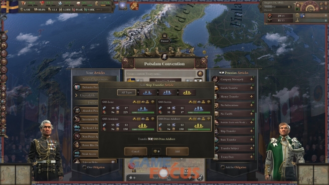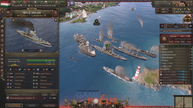 국가의 전략적 수요에 따라 함대를 설계하고 건조하라. 대양을 횡단하는 대양해군은 높은 비용이 요구되지만, 다른 국가에 영향력을 행사할 수 있는 강력한 투사 수단이다. 반면 연안해군은 연해 방어에 특화되어 있으며, 보다 효율적인 운용이 가능하다. 플레이어는 자신의 전략에 맞춘 군함을 설계할 수 있다.