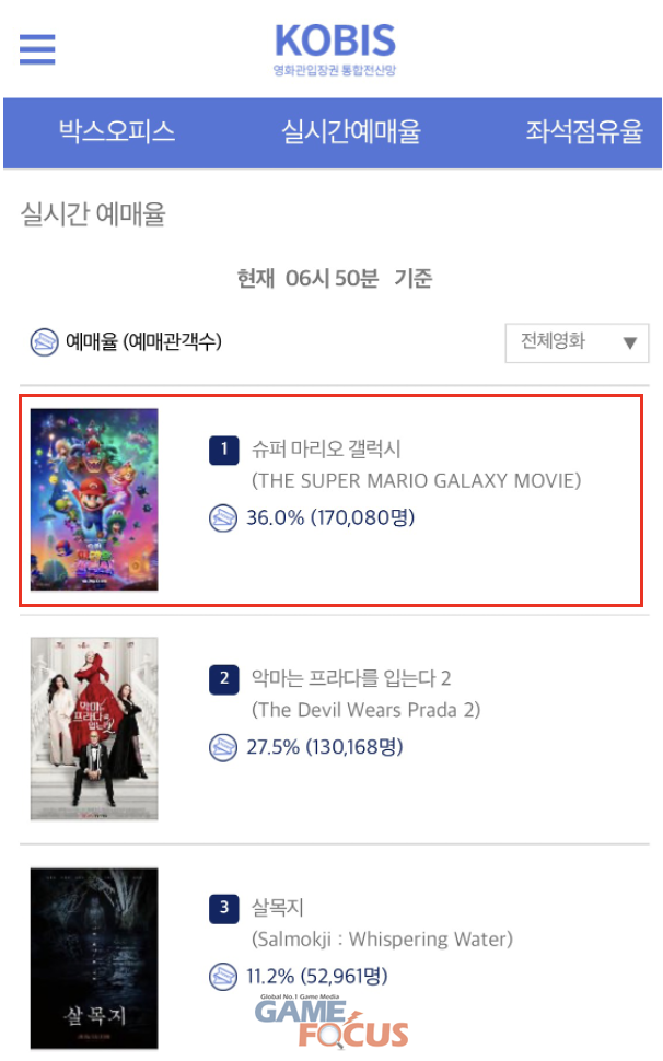 영화 <슈퍼 마리오 갤럭시>가 2일 연속 <악마는 프라다를 입는다 2>를 넘고 전체 예매율 1위를 수성했다. 또한 CGV 에그지수 94%, 롯데시네마 9.2, 메가박스 8.6점 등 극장 3사에서 모두 높은 만족도를 기록하며 향후 흥행에 대한 기대감을 높이고 있다.