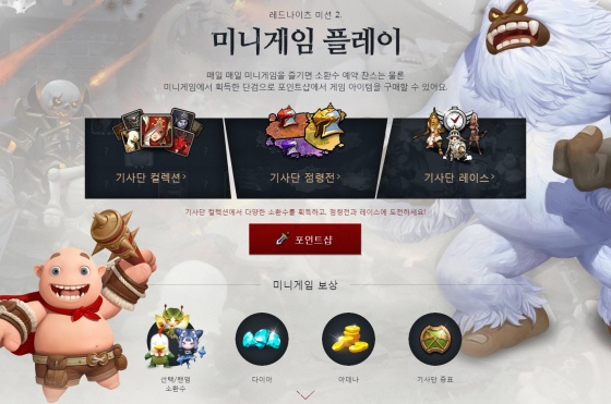 미니게임은 기사단 컬렉션, 기사단 점령전, 기사단 레이스 3종이다. 미니게임에서 얻은 보상은 12월 8일 출시 이후 사용 가능한 게임 아이템(다이아, 소모품, 아데나 등)으로 바꿀 수 있다. 엔씨소프트 모바일 앱 '버프(BUFF)'에 접속한 이용자들은 미니게임에 대한 추가 혜택을 받을 수 있다.