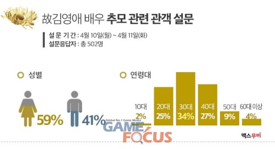 응답자 성비는 여성이 59%로 다소 높았고, 응답자 연령대는 30대가 34%로 가장 높았으나, 40대와 20대의 참여율도 각각 27%와 25%로 고르게 높게 나타났다. 응답자 성향으로 볼 때, 성별과 세대를 가리지 않고 故 김영애 배우를 향한 추모가 이어지고 있음을 확인할 수 있었다.