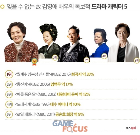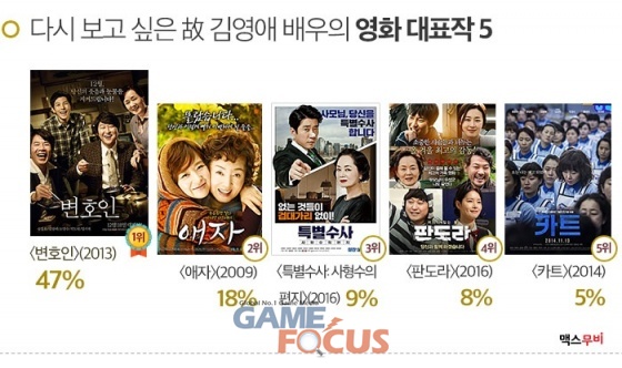 응답자들은 "그 시절, 우리 모두의 어머니를 김영애 배우를 통해 보았다", "가슴을 울리는 연기에 함께 울면서 '변호인'을 보았다" 등의 대표작 선정 이유를 전했다.