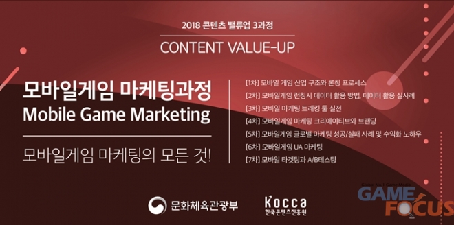 문화체육관광부(장관 도종환)와 한국콘텐츠진흥원(원장 김영준, 이하 한콘진)이 오는 10월 30일까지 '모바일게임 마케팅' 교육과정에 참가할 콘텐츠 분야 현업인을 모집하고, 11월 5일부터 서울 동대문구 홍릉에 위치한 한콘진 콘텐츠인재캠퍼스에서 교육을 진행한다.