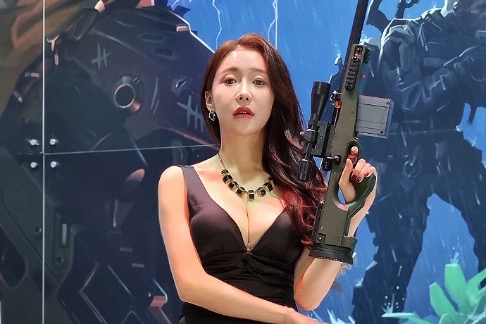 지난 17일부터 '지스타 2022'가 부산 벡스코에서 개최한 가운데 저격수로 변신한 모델이 관람객들을 맞이하고 있다.