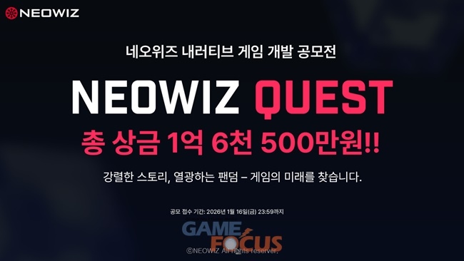 네오위즈가 개최중인 내러티브 인디게임 개발 공모전 '네오위즈 퀘스트'(NEOWIZ Quest)에 대한 관심이 뜨겁다. 2026년 1월 16일까지 약 1년의 모집 기간, 총 상...