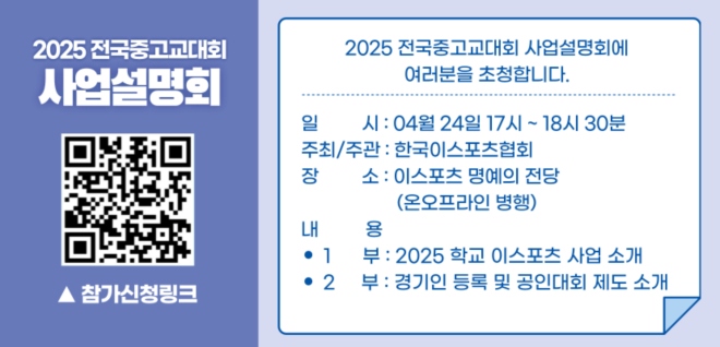 한국e스포츠협회(이하 협회)가 오는 4월 24일(목) ‘2025 전국중고교대회 사업설명회’를 개최한다고 10일(목) 밝혔다. ‘2025 전국중고교대회 사업설명회’가 2...