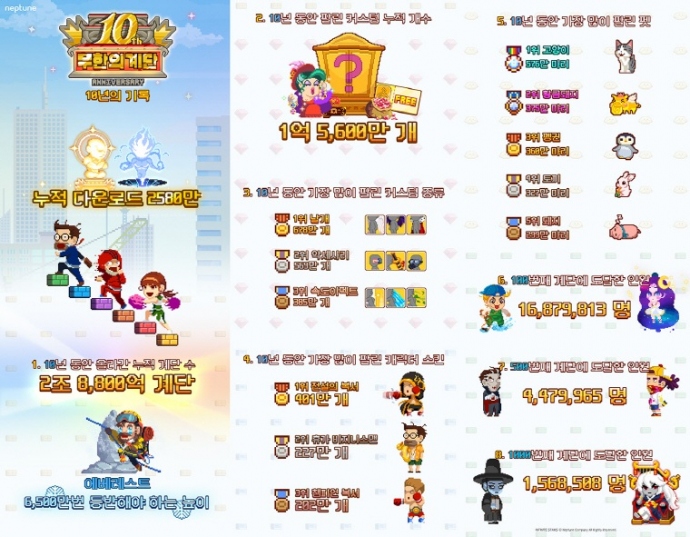 넵튠(각자대표 강율빈, 정욱)의 인기 모바일 게임 ‘무한의 계단’이 출시 10주년을 맞아 주요 성과를 담은 인포그래픽을 13일 공개했다. 2015년 출시된 '무한...