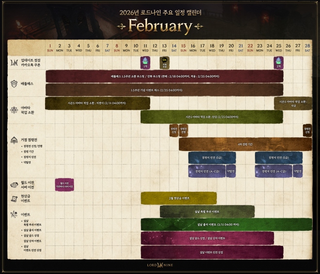스마일게이트는 올클래스 MMORPG ‘로드나인’(개발사 엔엑스쓰리게임즈)의 주요 업데이트 및 콘텐츠 등의 일정을 한눈에 확인할 수 있는 ‘주요 일정 캘린더’...