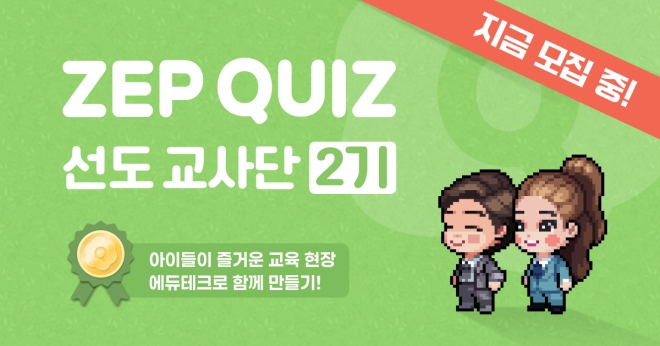 젭(ZEP, 대표 김원배, 김상엽)이 에듀테크의 미래를 이끌 ‘젭 퀴즈(ZEP QUIZ) 선도 교사단’을 모집한다고 23일 밝혔다. 젭 퀴즈 선도 교사단은 에듀테크 서비...