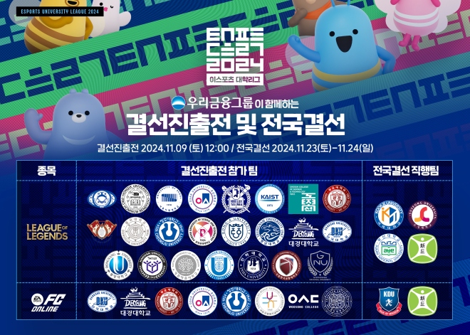 우리금융과 함께하는 ‘2024 이스포츠 대학리그’가 전국본선을 마치고 오는 11월 9일(토) 결선진출전에 돌입한다. 지난 9월에 시작된 전국본선은 11월 2일(토)...
