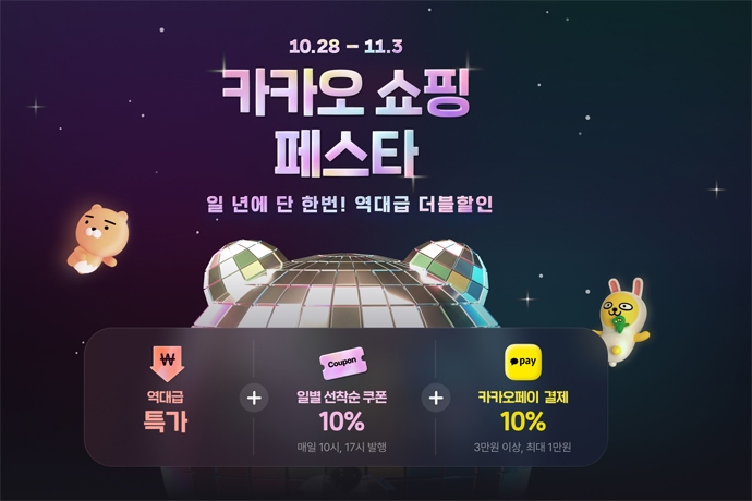 카카오(대표이사 정신아)가 연간 최대 커머스 행사인 ‘카카오 쇼핑 페스타'를 오는 11월 3일까지 개최한다. 카카오 쇼핑 페스타에는 카카오톡 ...