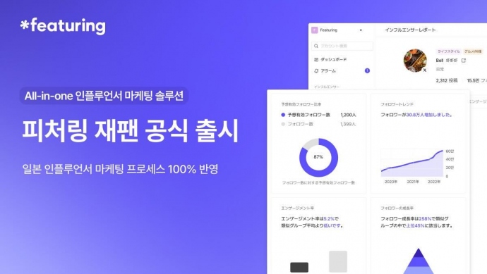 글로벌 SNS 데이터 분석 기업 피처링(대표 장지훈)이 일본 시장 공략을 위해 100% 현지화한 인플루언서 마케팅 솔루션 ‘피처링 재팬’을 출시했다고 밝혔다. 피...
