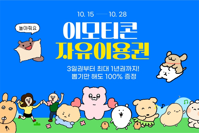카카오(대표이사 정신아)가 10월 15일부터 28일까지 약 2주간 ‘이모티콘 자유이용권 뽑기 이벤트’를 실시한다고 15일 밝혔다. 이번 이벤트는 카카오 이모티콘 ...