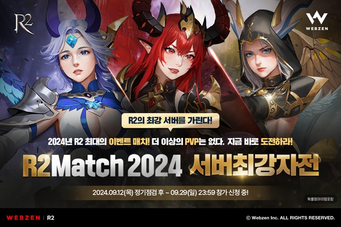 웹젠(대표 김태영)이 PC MMORPG 'R2'의 ‘R2Match 2024 서버 최강자전’ 개최를 예고하고 참가 신청 접수를 시작했다. R2는 어제(9월 12일)부터 오는 29일까지 P...