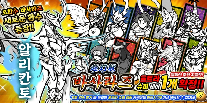 주식회사 포노스(대표 츠지코 요리카츠)는 병맛&귀염 타워디펜스 게임 '냥코대전쟁'에 2024년 9월 6일 11시부터 개최된 레어 뽑기 시리즈 ‘초환수 바사라즈...
