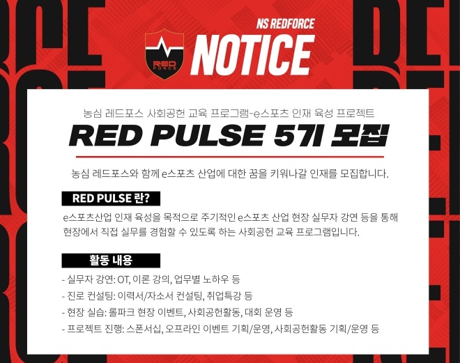 프로 e스포츠 구단 농심 레드포스가 RED PULSE(이하 ‘레드펄스’) 5기를 모집한다. '레드펄스'란 농심 레드포스만의 e스포츠 인재 육성 프로젝트로, e스포츠 산...