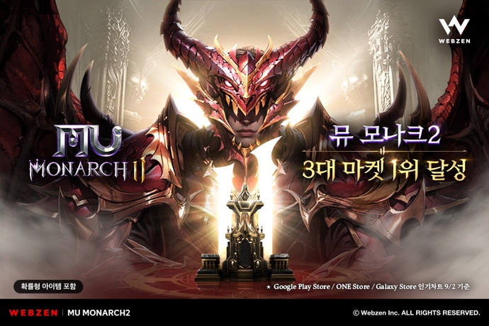 (주)웹젠(대표 김태영)의 신작 MMORPG ‘뮤 모나크2’가 9월 2일에 주요 앱마켓 세 곳에서 인기 순위 1위를 기록했다. 지난 29일 정식 서비스를 개시한 뮤 모나...