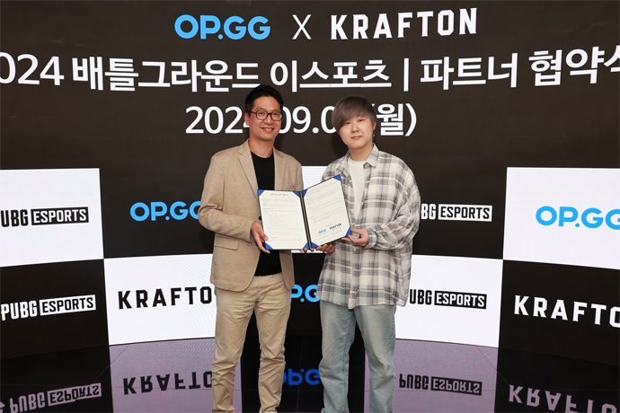 (주)크래프톤(대표 김창한)이 글로벌 게임 데이터 플랫폼 오피지지(OP.GG)와 'PUBG: 배틀그라운드(이하 배틀그라운드)' e스포츠 파트너십을 위한 협약식을 체결...