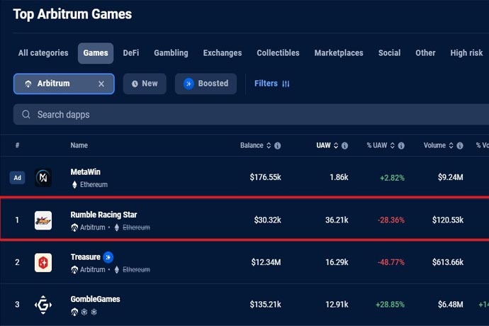 디랩스 게임즈(대표 권준모)는 자사의 웹3 게임 럼블 레이싱 스타가 댑레이더(DappRadar)기준 아비트럼 게임 카테고리 1위를 달성 했다고 밝혔다. 탈중앙화 애플...