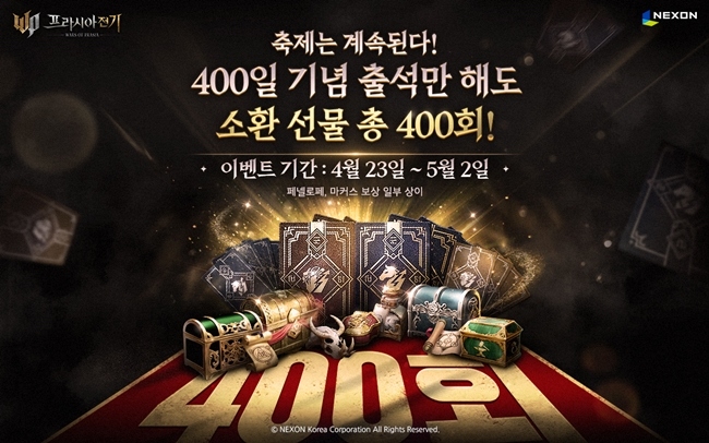 넥슨(공동 대표 강대현, 김정욱)이 23일 자사에서 개발한 MMORPG '프라시아 전기'에 정식 서비스 400일 기념 이벤트를 실시한다. 먼저 5월 2일까지 접속만 해도 ...