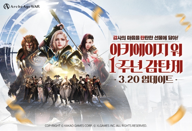 카카오게임즈(대표 조계현)는 6일, PC/모바일 크로스플랫폼 MMORPG ‘아키에이지 워’의 서비스 1주년 기념 업데이트 사전예약을 시작했다. 3월 20일 예정된 ‘...