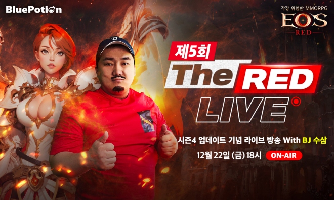 블루포션게임즈(대표 정재목)가 자사에서 직접 개발하고 서비스하는 모바일 정통 MMORPG ‘에오스 레드’ 유저와의 소통을 강화하기 위하여 ‘제5회 The RED Liv...