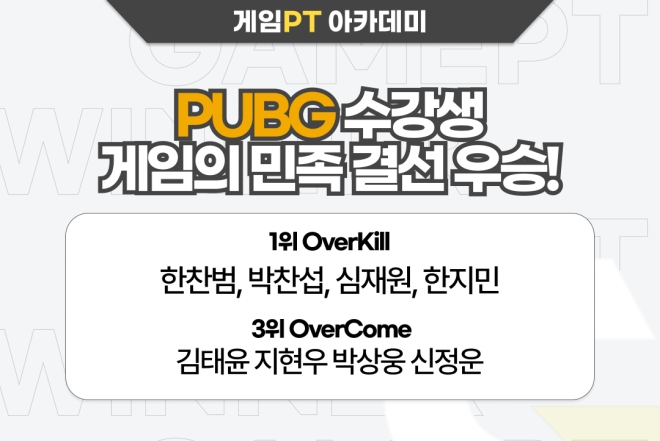 게임PT(대표 홍태욱)는 자체 수강생으로 이루어진 2개팀이 '게임의 민족 PUBG 대회'에서 우승을 차지했다고 밝혔다. 게임의 민족 PUBG 대회는 아마추어 플레이...